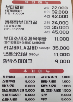 가격: 햄폭탄부대찌개(2인) 26,000원 / 스팸 추가 5,000원 / 공깃밥 1,000원 / 라면사리 1,000원